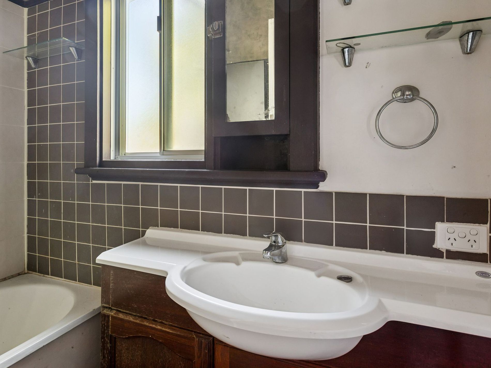 • Retro-style bathroom with shower over bath