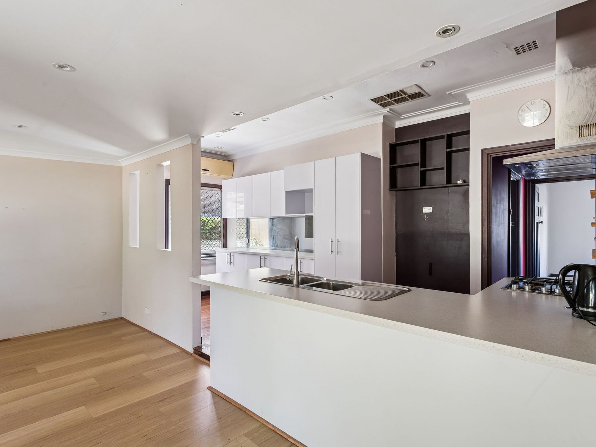 • Updated open-plan kitchen with laminate stone-look benchtops and stainless steel appliances